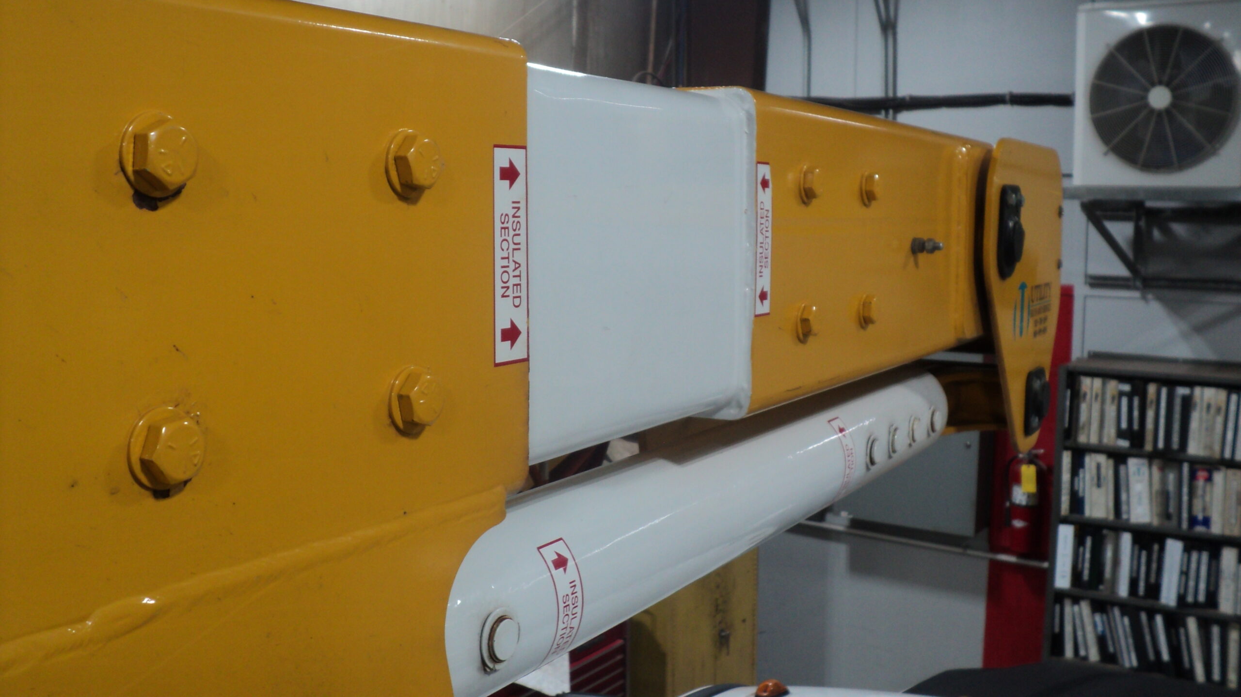 OSHA defines an insulated aerial device as “an aerial device designed for work on energized lines and apparatus” (CFR 1910.67). These devices are often recognized by their fiberglass booms and components — but always verify this via the data placard.